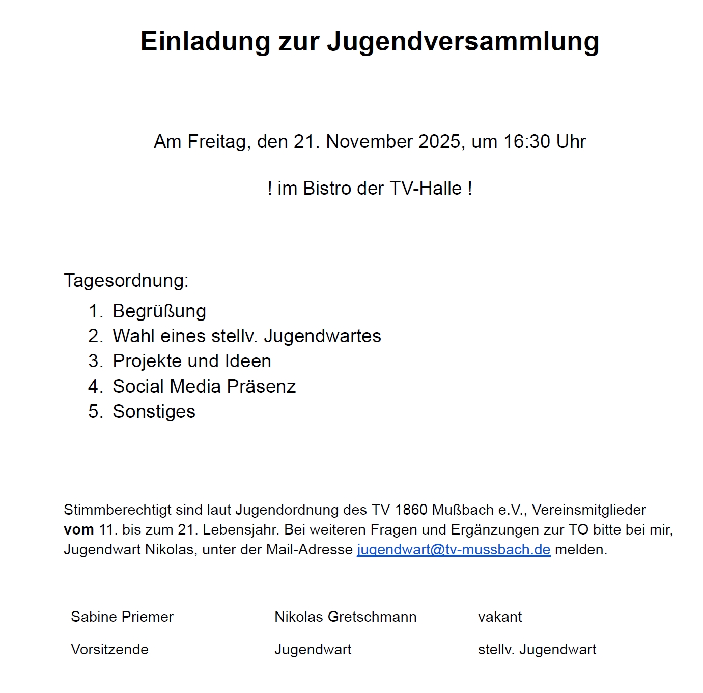 Jugendversammlung am 21.11.2025 um 16:30 Uhr im Bistro
