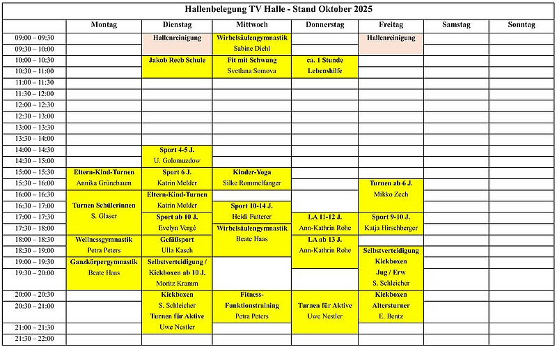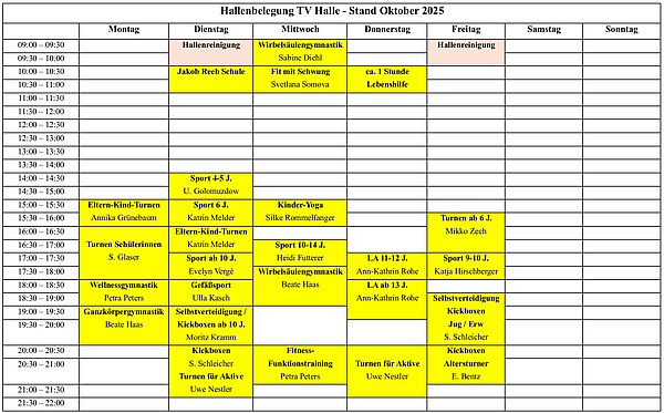 | 20:00 - 21:00 | Turnen für Aktive (Frauen und Männer) | Uwe Nestler | 01759155839 | TV-Halle |